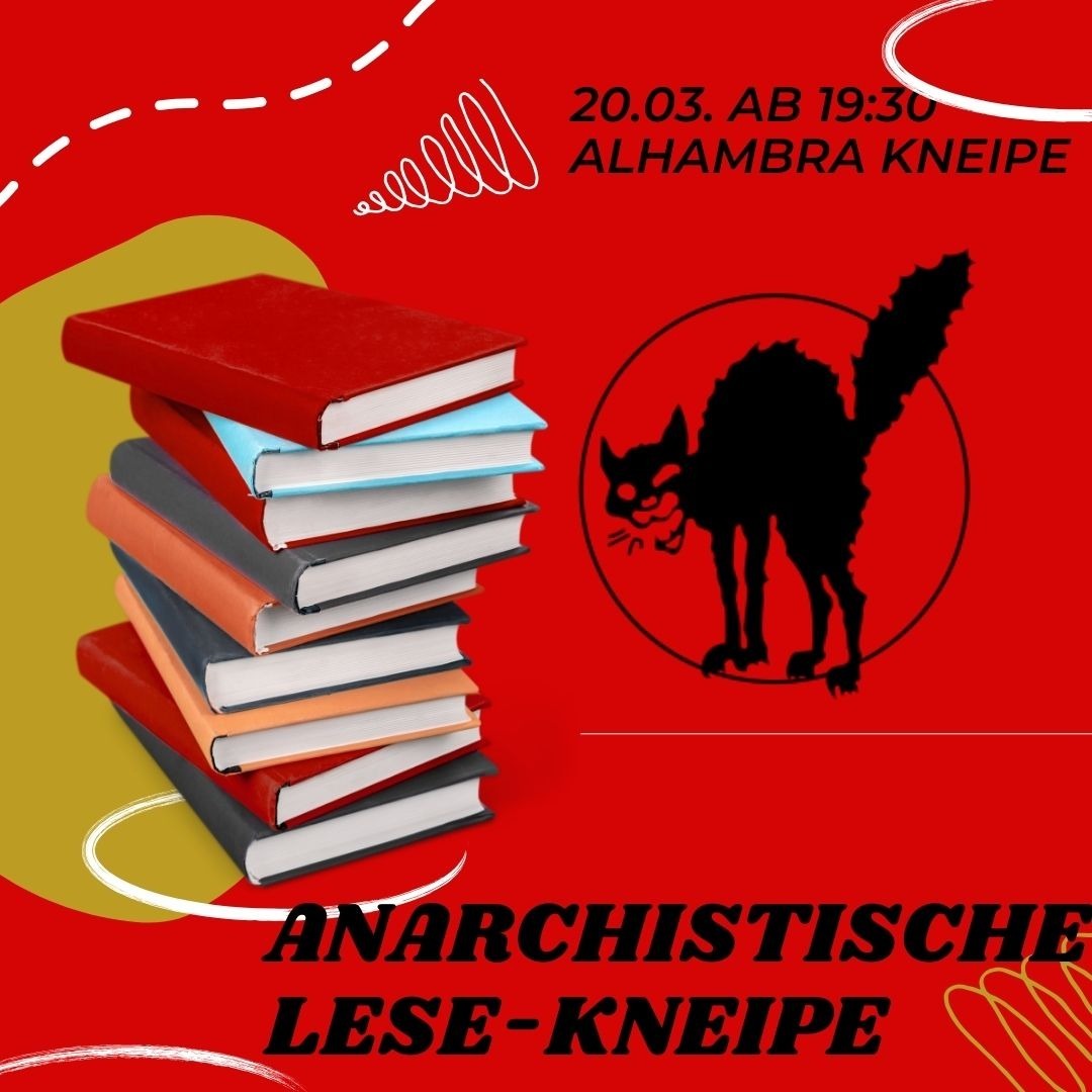 Kommt diesen Freitag in der Alhambra Kneipe vorbei zur anarchistischen (Lese)Kneipe, es gibt Getränke, Lesestoff und Raum für Gespräche. Ab 19:30 Uhr!