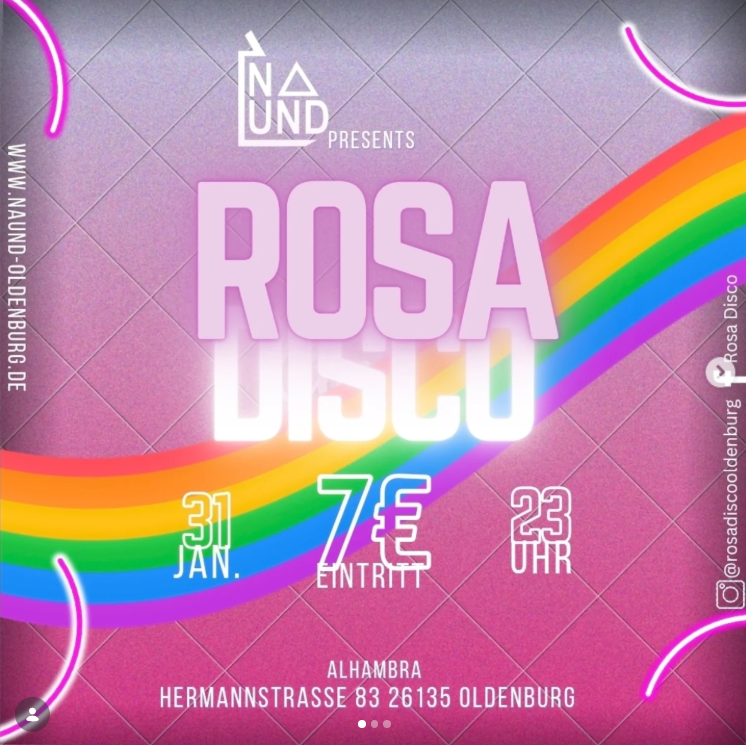 Jeden letzten Samstag im ungeraden Monat findet im Alhambra – Hermannstraße 83 in Oldenburg – ab 23:00 Uhr die Rosa Disco statt. Die Rosa Disco ist die größte queere Party in Oldenburg – und dies nun schon seit 1988. Viele Gäst_Innen feiern – mit uns – bis in die frühen Morgenstunden.